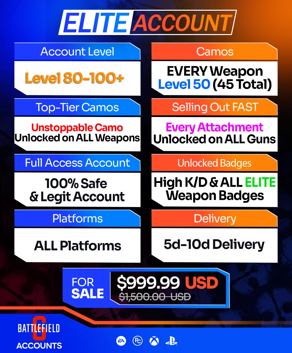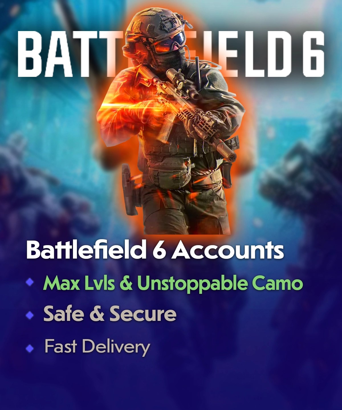 We offer a variety of Battlefield 6 Accounts For Sale, including features like Meta Guns, Max Level Weapons, High Account Levels, and the Unstoppable Force Camo. Every account is 100% Safe & Secure!
