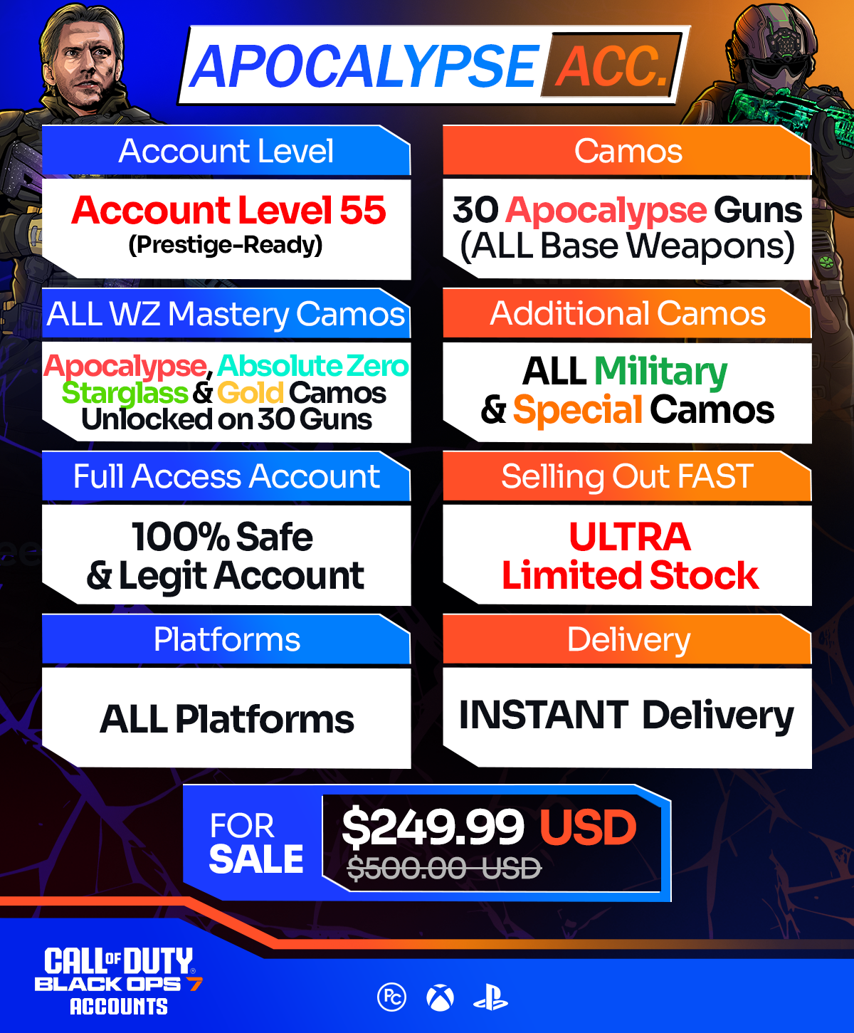 - LIMITED Apocalypse Accounts Apocalypse, Absolute Zero, Starglass, and Golden Dragon Camos Unlocked on ALL 30 Base Weapons, Account Level 55, Prestige-Ready, Attachments, & more!