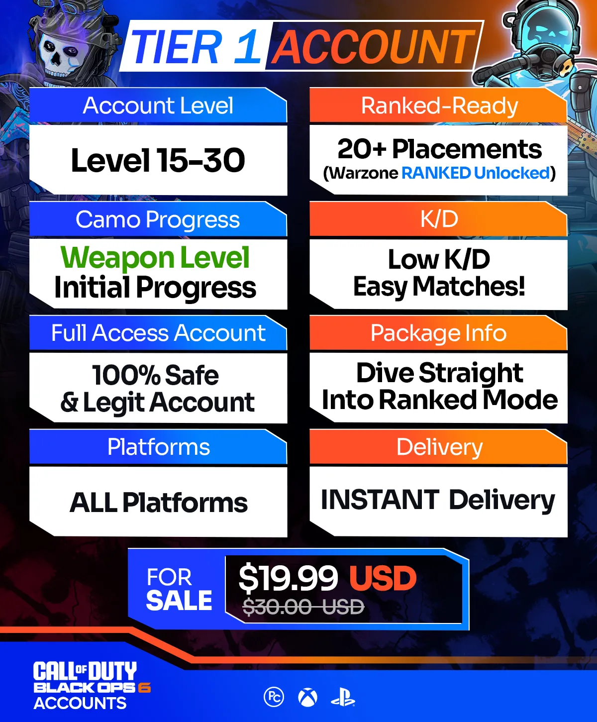 - Tier 1: Warzone Ranked-Ready, Account Level 15-30, 20+ Placement Matches Played (Ranked Mode Unlocked) & more!