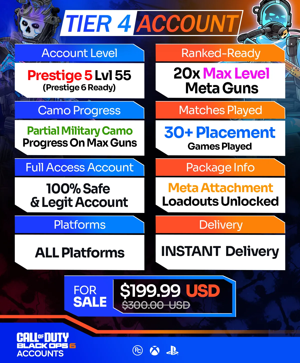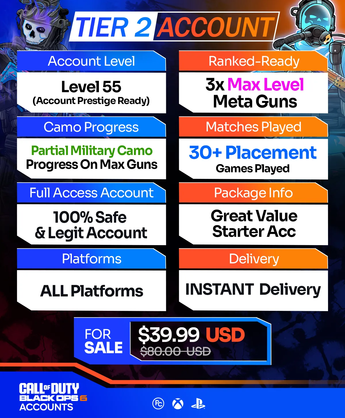 Additionally, our Warzone Accounts are fully compatible with any existing accounts you own and can be used across supported titles like Black Ops 7, Black Ops 6 and Modern Warfare 3!
