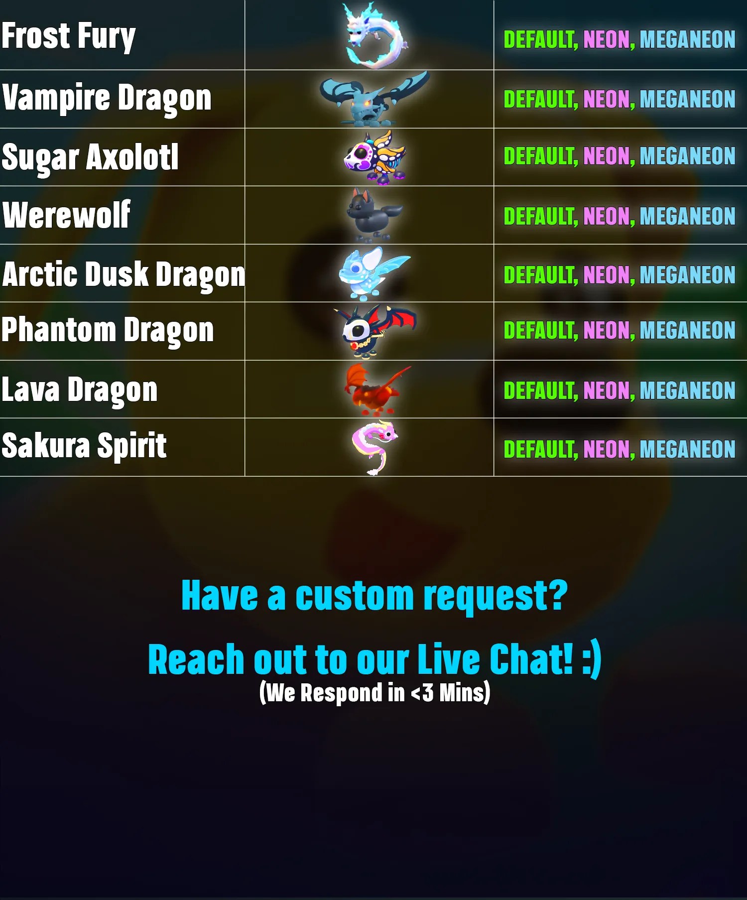 Are you looking for other Pets, Items, or Potions we don’t offer? Contact our 24/7 Live Chat Support and we will see if we can arrange it for you as a custom order!
